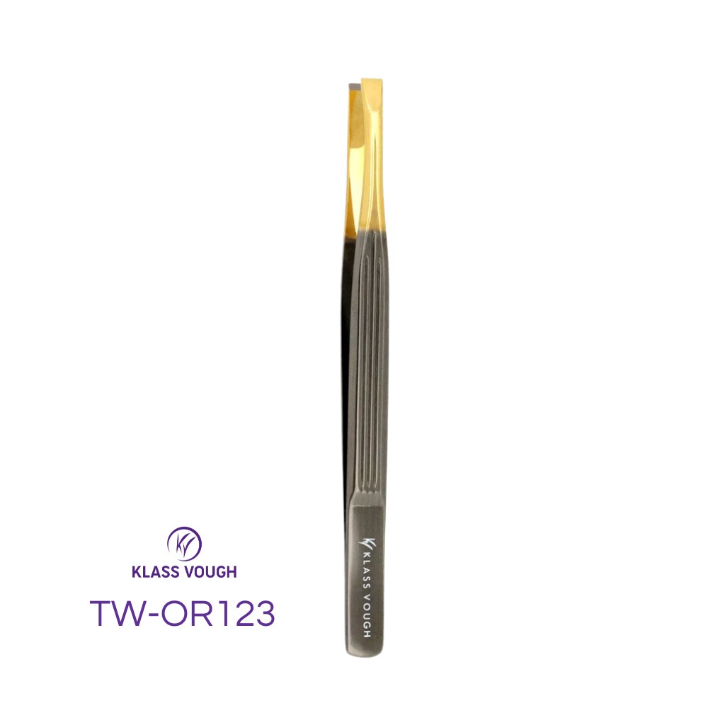 Pinça com ponta dourada reta com leve inclinação para dentro e cabo texturizado, ideal para limpar o contorno da sobrancelha e retirar os pelos em excesso.