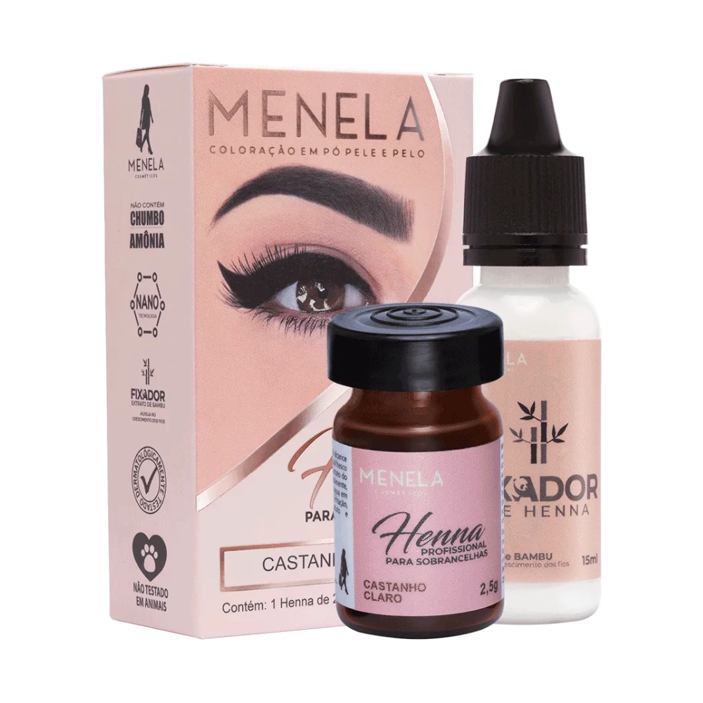 Nossa henna Castanho Claro não contém chumbo, amônia e nem peróxido de hidrogênio (conhecido comercialmente como água oxigenada) é livre de metais pesados. A henna MENELA tem em sua composição: extrato da planta Lawsonia inermes (henna), e micro partículas (nanotecnologia).