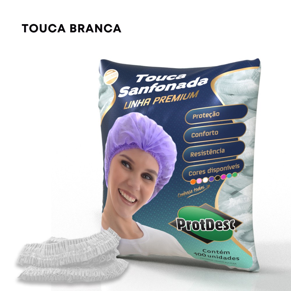 Touca sanfonada descartável confeccionada em TNT de estrutura flexível, plana e porosa, por processo automatizado.